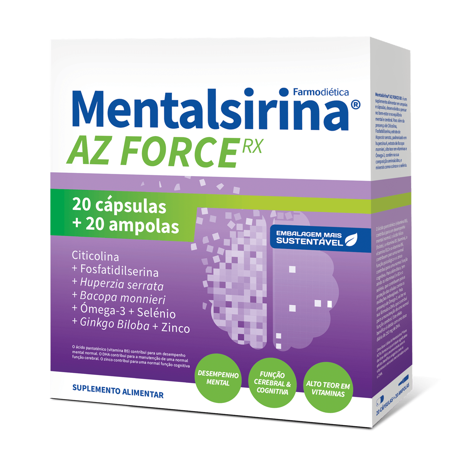 Mentalsirina® AZ Force Rx es un complemento alimenticio en ampollas y cápsulas, desarrollado pensando en el bienestar y el equilibrio mental y cerebral. Contiene citicolina, fosfatidilserina, extracto de Huperzia serrata y Bacopa monnieri, Ginkgo Biloba y omega-3. También contiene minerales como el zinc y el selenio y un alto contenido en vitaminas.