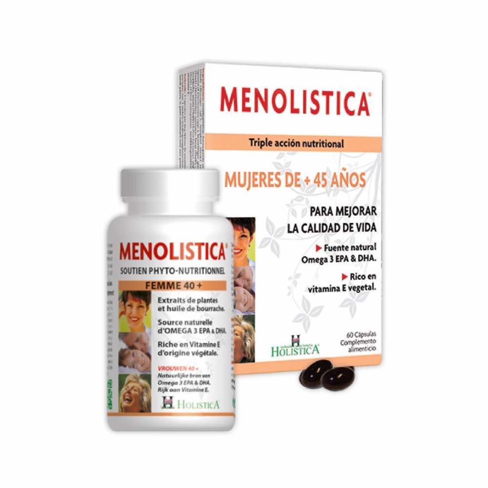 Indicado para la menopausia La menolística 60 cápsulas es una ayuda específica y preciosa para las mujeres de 40 años y más, para mantener la forma ideal de energía y bienestar. Para que las mujeres puedan seguir disfrutando de su feminidad con el placer de los sentidos y permanecer felices con su cuerpo. PRESENTACIÓN 60 Cápsulas.