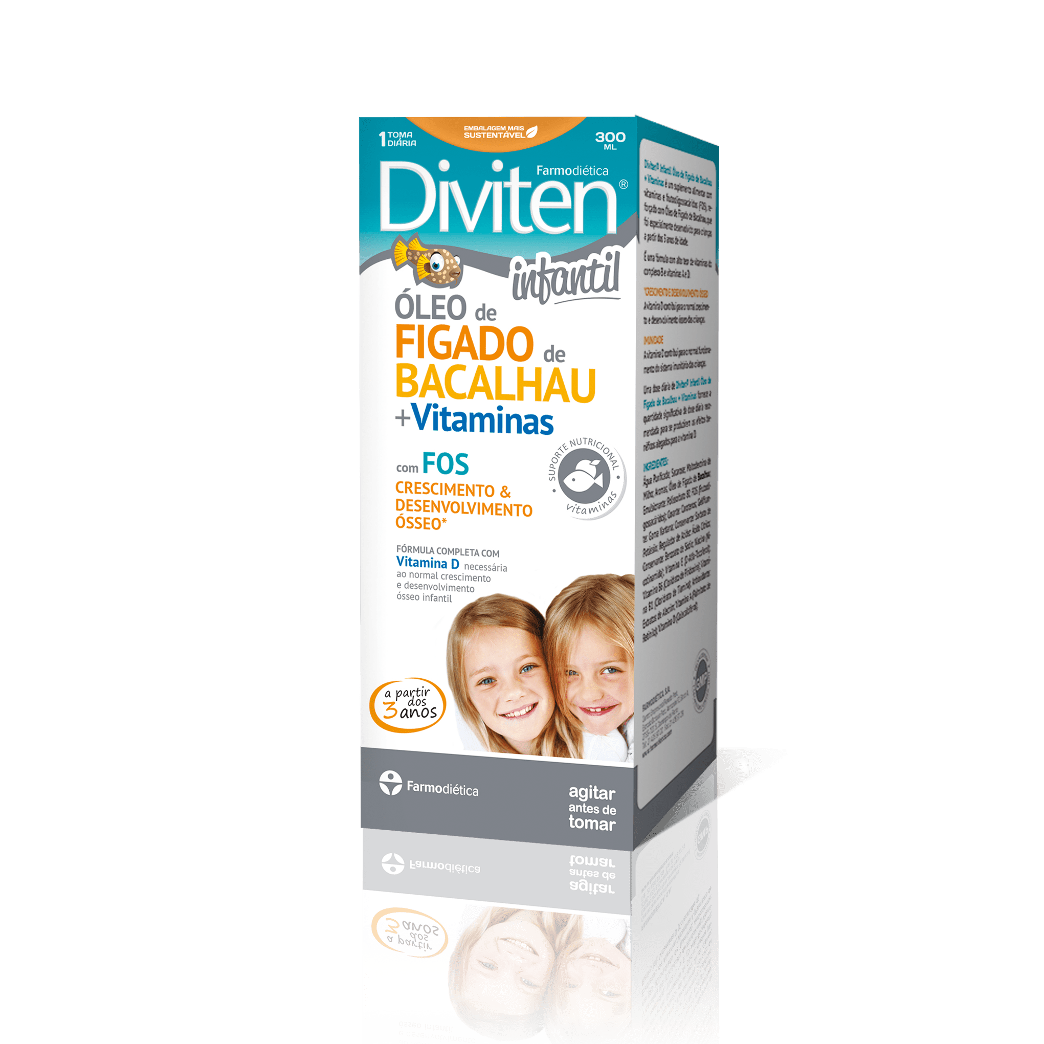 Diviten Infantil Óleo de Fígado de Bacalhau é uma fórmula completa com Vitamina D necessária ao normal crescimento e desenvolvimento ósseo infantil. É um suplemento alimentar que contém prebióticos (FOS), vitaminas e óleo de fígado de bacalhau, rico em ómega-3, vitamina A e vitamina D.