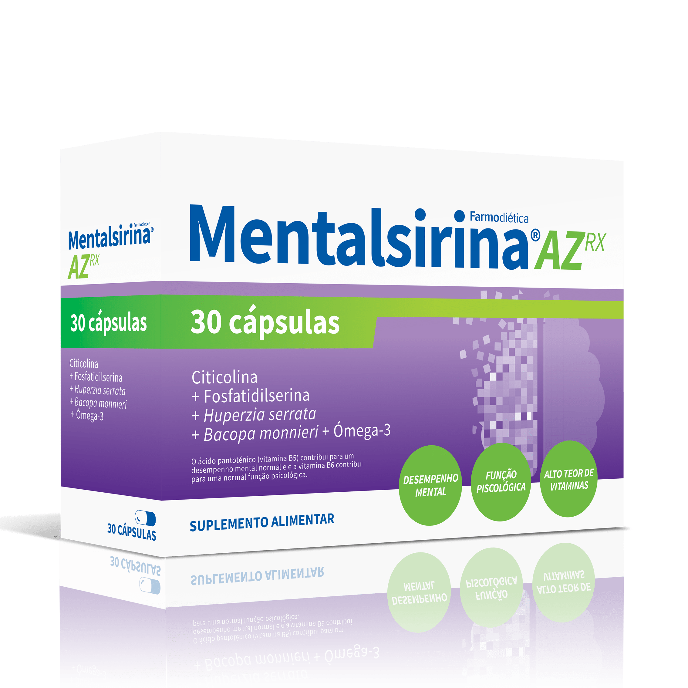 Mentalsirina® AZ Rx é um suplemento alimentar desenvolvido a pensar no bem-estar e no equilíbrio mental e cerebral. Contém Citicolina, Fosfatidilserina, um extrato de Huperzia serrata, padronizado em huperzina A, Bacopa monnieri, ácidos gordos ómega-3 e alto teor em vitaminas.