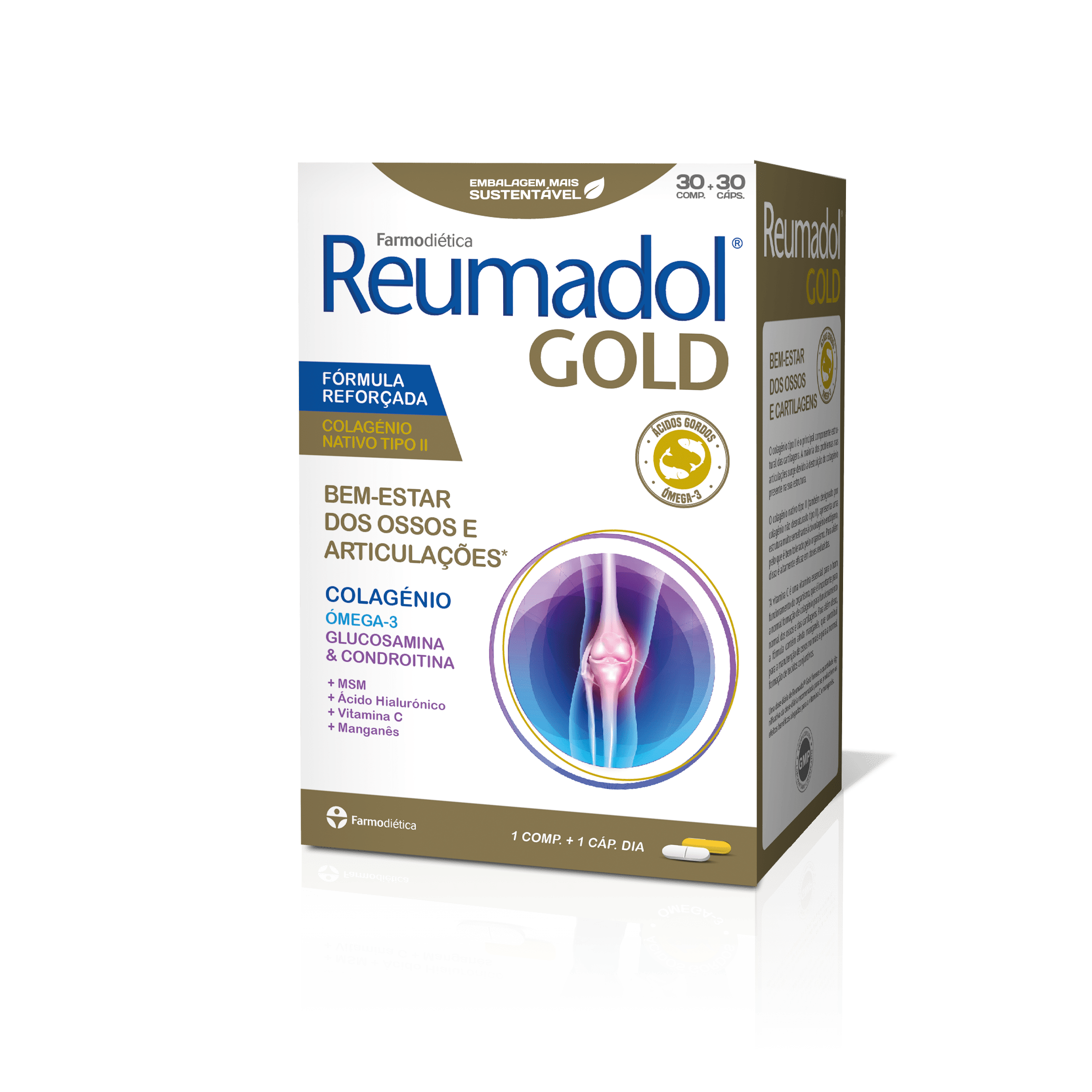 Reumadol Gold é um suplemento alimentar que contém um complexo de glucosamina, condroitina, mentil-sulfonil-metano (MSM), colagénio, ácido hialurónico, silício, quercetina, alto teor de vitamina C e manganês.